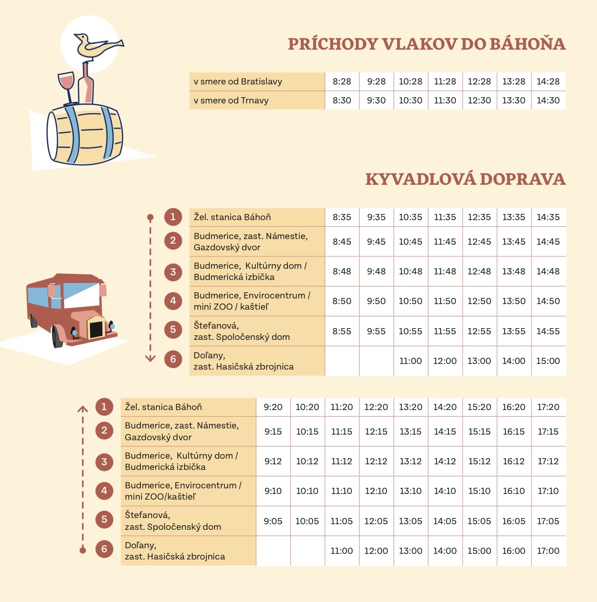 V sobotu 14. februára sme pre vás zabezpečili kyvadlovú dopravu zo železničnej stanice Báhoň do Budmeríc a Dolian a späť. Či už prídete v smere od Bratislavy alebo Trnavy, každú hodinu vás turistický vláčik odvezie od 8.35 do 14.35 zo stanice Báhoň a poobede zase odvezie späť na stanicu. Bez auta sa zaobídete aj v Budmericiach, kde sa vláčikom budete môcť presúvať medzi Gazdovským dvorom, kultrnym domom s Budmerickou izbičkou, Envirocentrom a mini ZOO.